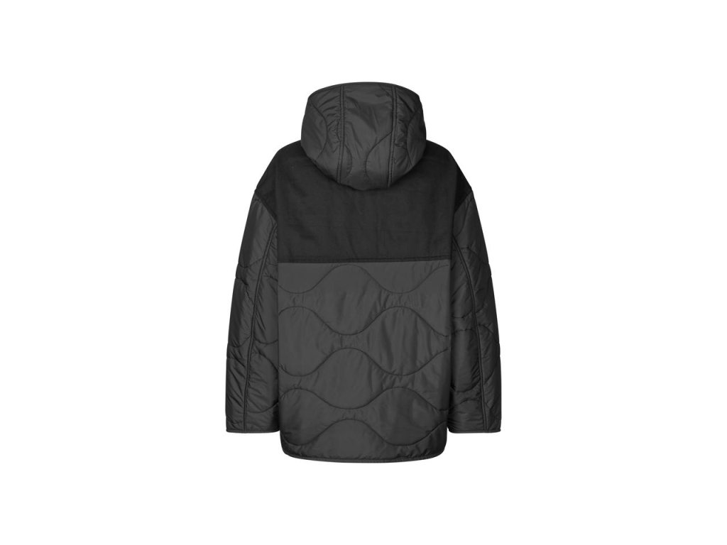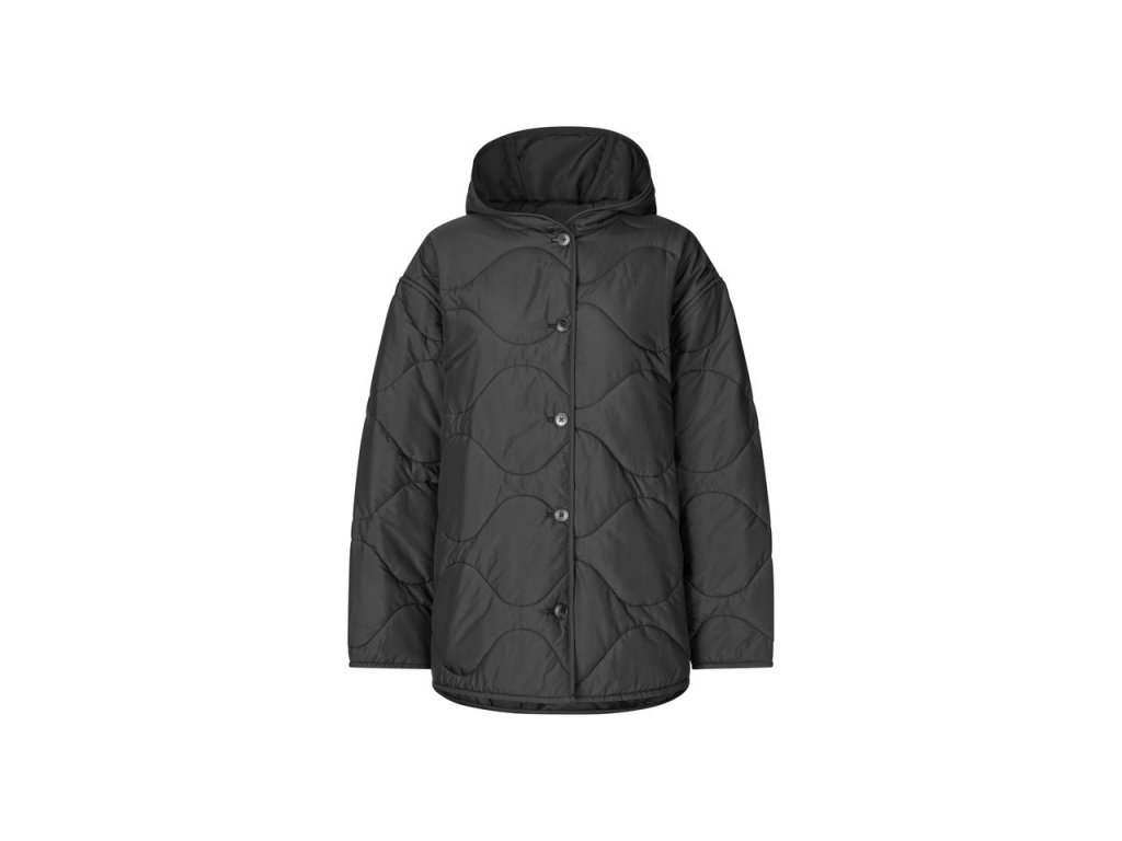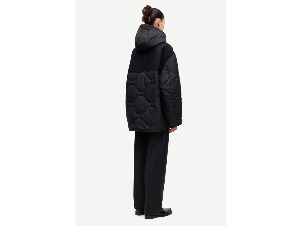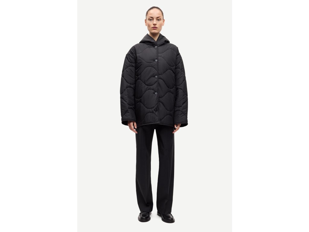 Dámska bunda s kapucňou vo voľnom oversized strihu a padajúcimi ramenami. Vpredu má zapínanie na gombíky a bočné rozparkové vrecká. Na zadnej strane je potlačené logo Samsøe Samsøe. Bunda má prešívaný vzor a je čiastočne vypodložená pre väčšie pohodlie. Hlavný materiál je zo 100 % recyklovaného polyesteru s bavlnenou vložkou na zadnej strane. Produkt je GRS certifikovaný, pričom každý krok dodávateľského reťazca spĺňa prísne sociálne, environmentálne a chemické normy.